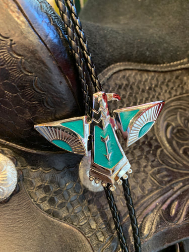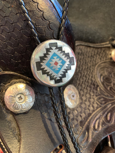 BT-250 Aztec Bolo Round Tie with Turquoise & Coral Inlay